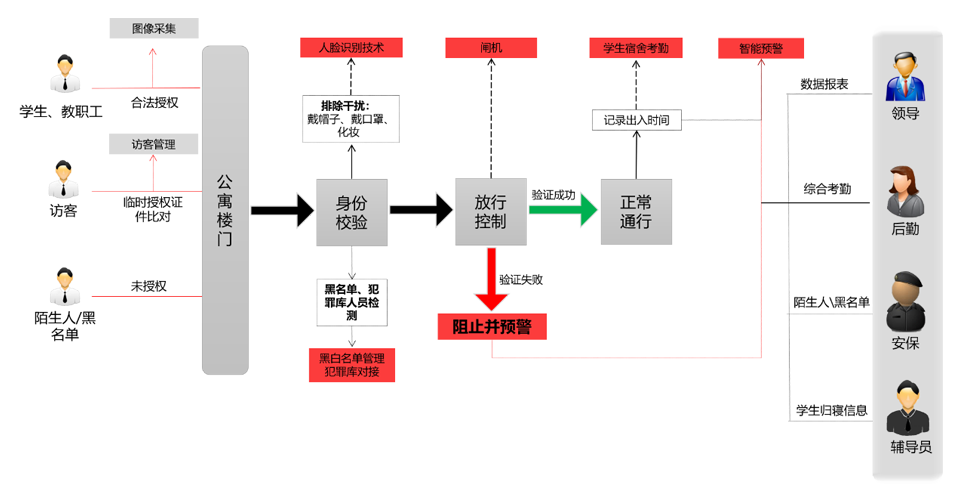 系统具备公寓出入口实时管控、公寓日常事件登记、异常信息报警通知、学生归寝分析等多种功能,杜绝了非本公寓人员随意进出公寓,既提升了公寓安全,有方便了公寓内部管理。从而为用户构建了安全便捷且具经济管理效益的工作生活环境。